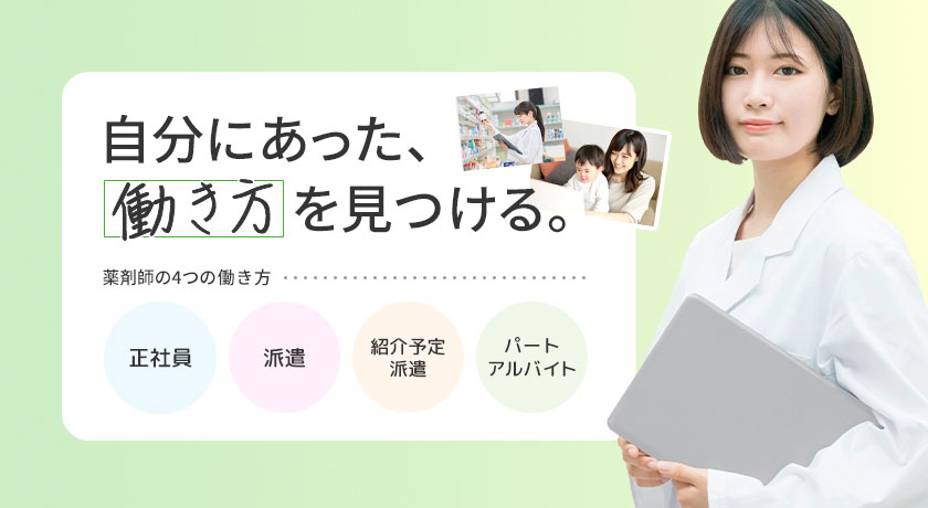 薬剤師には正社員、パート・アルバイト、紹介予定派遣、派遣の4つの働き方があります。将来に向けて「今どんな働き方が自分に向いているのか」フレキシブル考えていくのが上手な転職です。